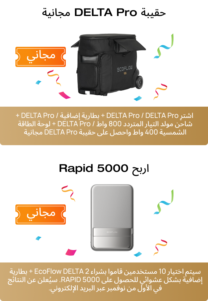 - لن تتحمل شركة EcoFlow مسؤولية أي خسائر أو أضرار مباشرة أو غير مباشرة يتكبدها أي طرف، بما في ذلك المشاركين، سواءٌ تتعلق بهذه الحملة أو ناشئة عن أفعال أو إغفالات مرتبطة بها، أو بأي طريقة كانت.