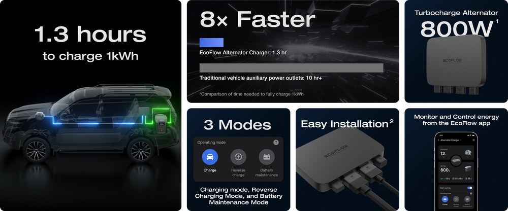 اشحن أثناء القيادة باستخدام شاحن مولد التيار المتردد من EcoFlow بقدرة 800 واط الذي نقدّمه لك، وقم بتعبئة محطة الطاقة في غضون 1.3 ساعة فقط. يقوم شاحن مولد التيار المتردد من EcoFlow بقدرة 800 واط بشحن الطاقة أسرع 8 مرات من منافذ الطاقة الإضافية التقليدية في السيارة ببساطة عن طريق استخدام الطاقة الزائدة التي تولدها سيارتك.