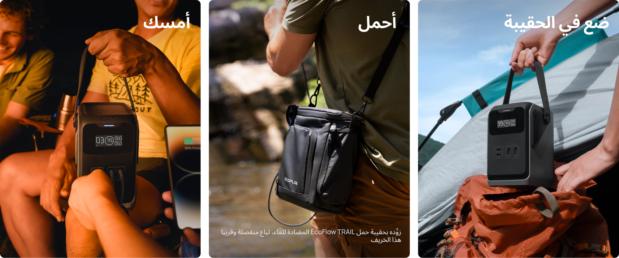 بفضل احتوائه على خلايا بطارية عالية الجودة وطويلة العمر مع نظام إدارة ذكي، تضمن محطة طاقة TRAIL واحدة حرية تامة في توفير الطاقة في الخارج لمدة 5 سنوات. طبقات الحماية الخمس في الداخل والخارج تضمن عدم التلف بسبب السقوط، وهي مصممة هندسياً لتحمل الصدمات والاهتزازات أثناء التنزه أو تسلق الجبال أو السفر دون قلق. زوده بحقيبة الحمل المضادة للماء* لحماية أجهزتك من البلل أثناء رحلات الصيد أو التجديف بالكاياك. حقيبة الحمل المضادة للماء لسلسلة TRAIL تباع بشكل منفصل وسوف تكون متاحة قريبا هذا الخريف.